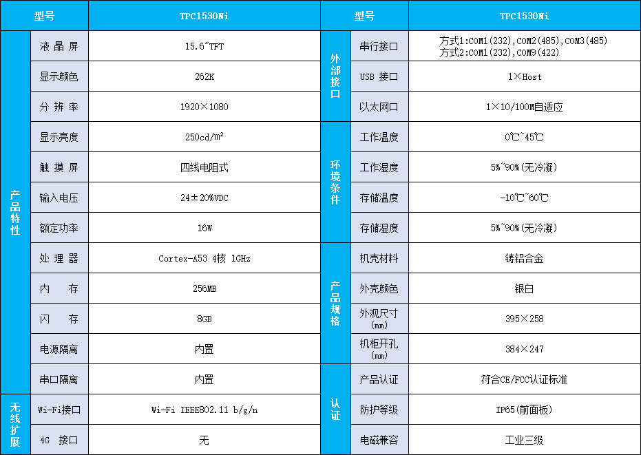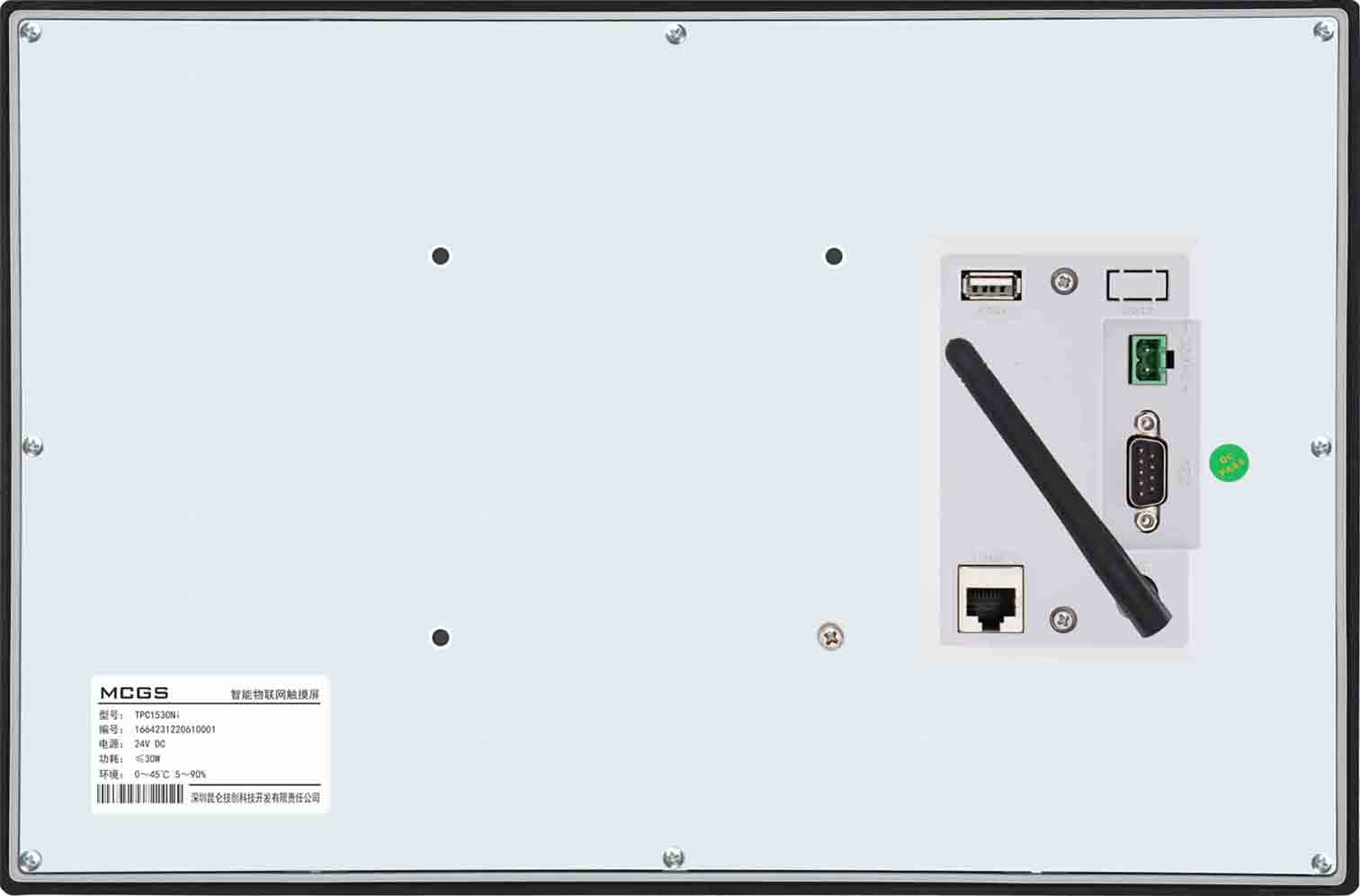 TPC1530Ni,是以Cortex-A7多核CPU为核心、主频1GHz的智能物联网触摸屏,该产品设计采用15.6英寸TFT液晶显示屏,分辨率1920*1080,四线电阻式触摸屏,同时还预装了McgsPro组态软件(运行版)
